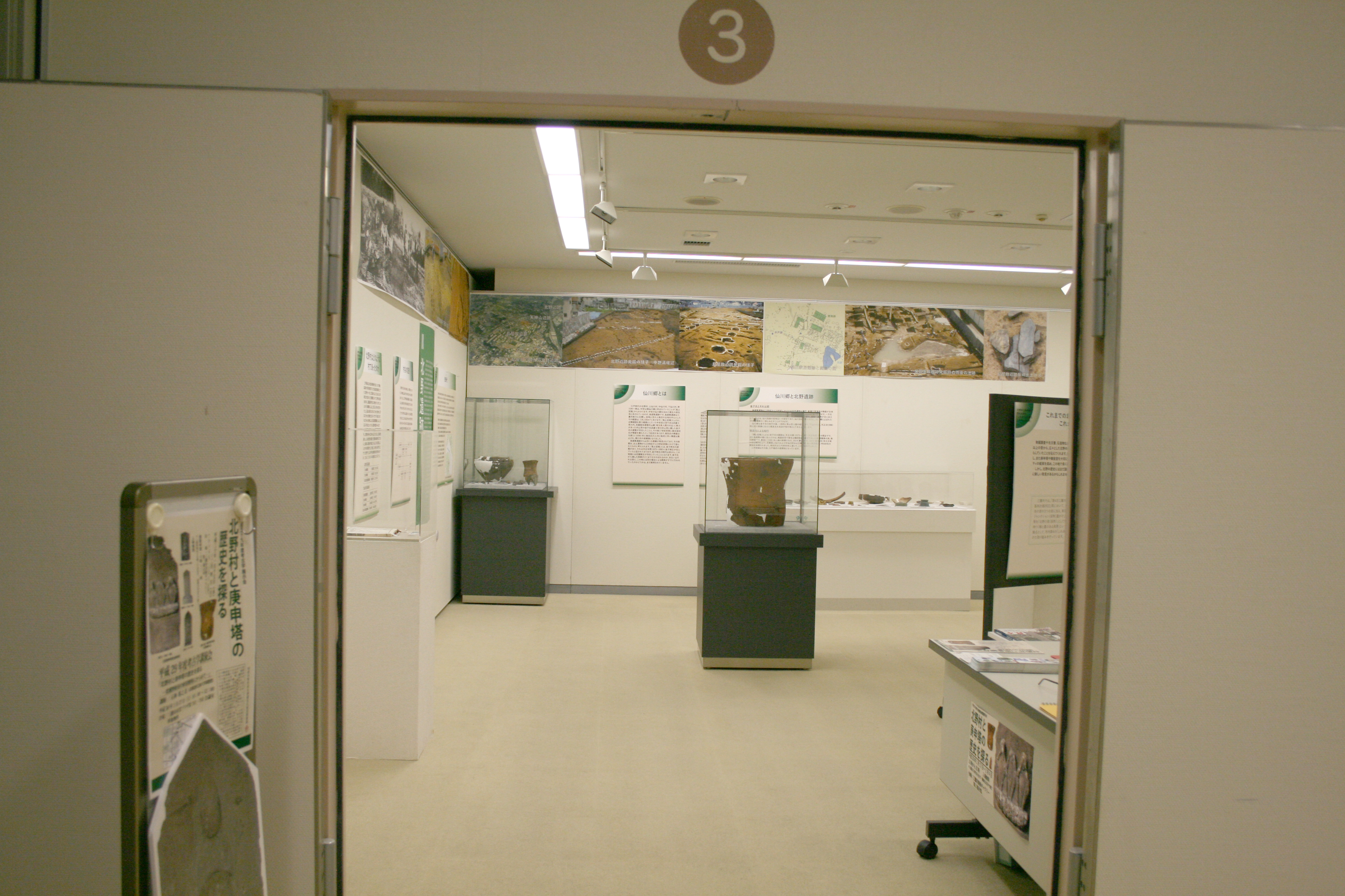 北野村は、寛文末年頃の開発によって開村されました。元禄8(1695)年の検地で、織田家によって検知され、一村として扱われます(『新編武蔵風土記稿』より)。しかし、北野村の地域(現在の北野地区)は、近年の発掘調査により、旧石器や縄文時代の遺物や住居跡が多くみつかっています。中世の遺構や遺物も確認されており、武蔵七党村山党の金子氏や柴田家との関係なども考えられます。近世では古武術の流派である天然理心流や八王子千人同心と北野村との関係についての資料も展示します。