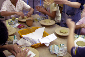材料は、「テラコッタ粘土」。まず良さそうなかたさに練って、おダンゴ状にした粘土を円ばん形につぶします。これが土器の底。その上にひも状にした粘土を輪っかにして積み上げて行きます。