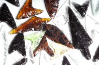 | 原石 | 良質の黒曜石を採取するのは、昔も今も難しいです。しかし現在は、産地から購入し、宅配便で送ってもらうことができます。写真の黒曜石は、北海道産のものです。 原石は、風化のため白っぽくなっています。 黒曜石がなくても、板ガラスやビール瓶また各種のジュース瓶で代用できます。 |