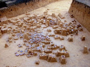 出土した遺物は石器が約二千五百点、礫が約八千点。ローム層(赤土)の最上部から深さ約一.五mくらい(今から約一万二千年前から、約二万五千年ほど前の地層)にかけて発見されました。石器は主にナイフ形石器や角錐状石器、掻器、削器など、後期旧石器時代に特徴的な道具類です。