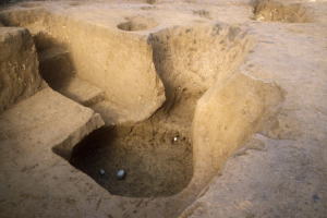 しかし、平成12年度の発掘調査では地下式坑(ちかしきこう)と呼ばれる遺構2基が発見されました。地下式坑は、地表からの竪坑を経て地下室に至る構造の遺構で、埋葬に係わる施設あるいは物品の貯蔵施設などと考えられています。構築時期は、古墳時代とされるものや、中世〜近世などにおよんでいますが、特に関東地方においては、中世〜近世に盛んに造られました。